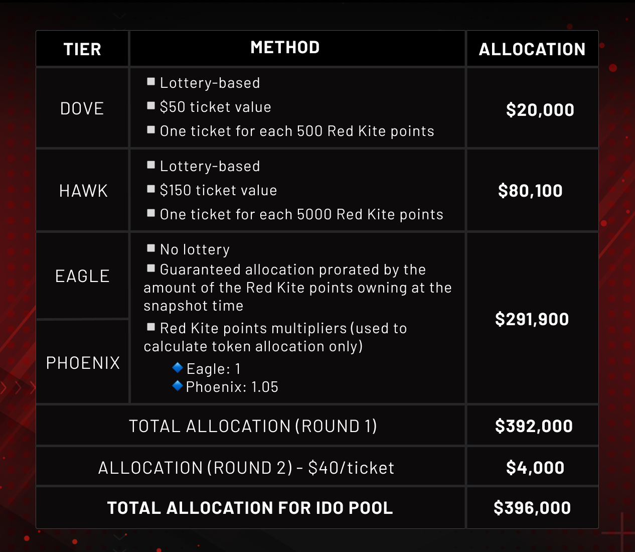 There are 2 pools for Kaizen Finance IDO on the Red Kite launchpad: IDO pool ($396,000) and Community pool ($4,000).