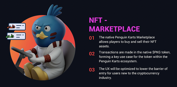 Players can race against each other earning NFTs along the way that can be used in-game or sold at the in-game marketplace. In addition, the platform’s player-friendly Tokenomics strives to create a sustainable NFT economy by facilitating the exchange of NFTs and other digital collectibles in the Penguin Karts marketplace.