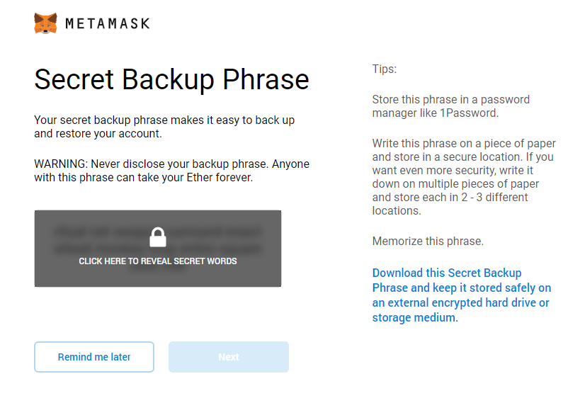 6. Create a password to access your MetaMask securely. Your new wallet comes with a secret backup phrase. Make sure to note down the phrase in a secure location for later uses.
