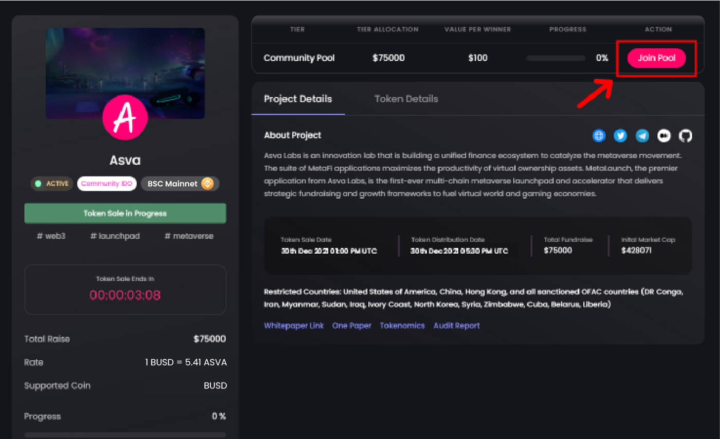 Step 1: Participants shall click on the Community IDO project from the âUpcoming Poolâ section.